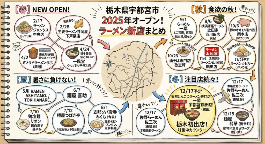 025年に栃木県宇都宮市でオープンしたラーメン店を総まとめ!ついに上陸した「一蘭」や「一風堂」などの大型店から、こだわり抜いた個人店の「鶏白湯」「G系」「佐野ラーメン」まで、今年話題のニューオープン店を一挙にご紹介します。